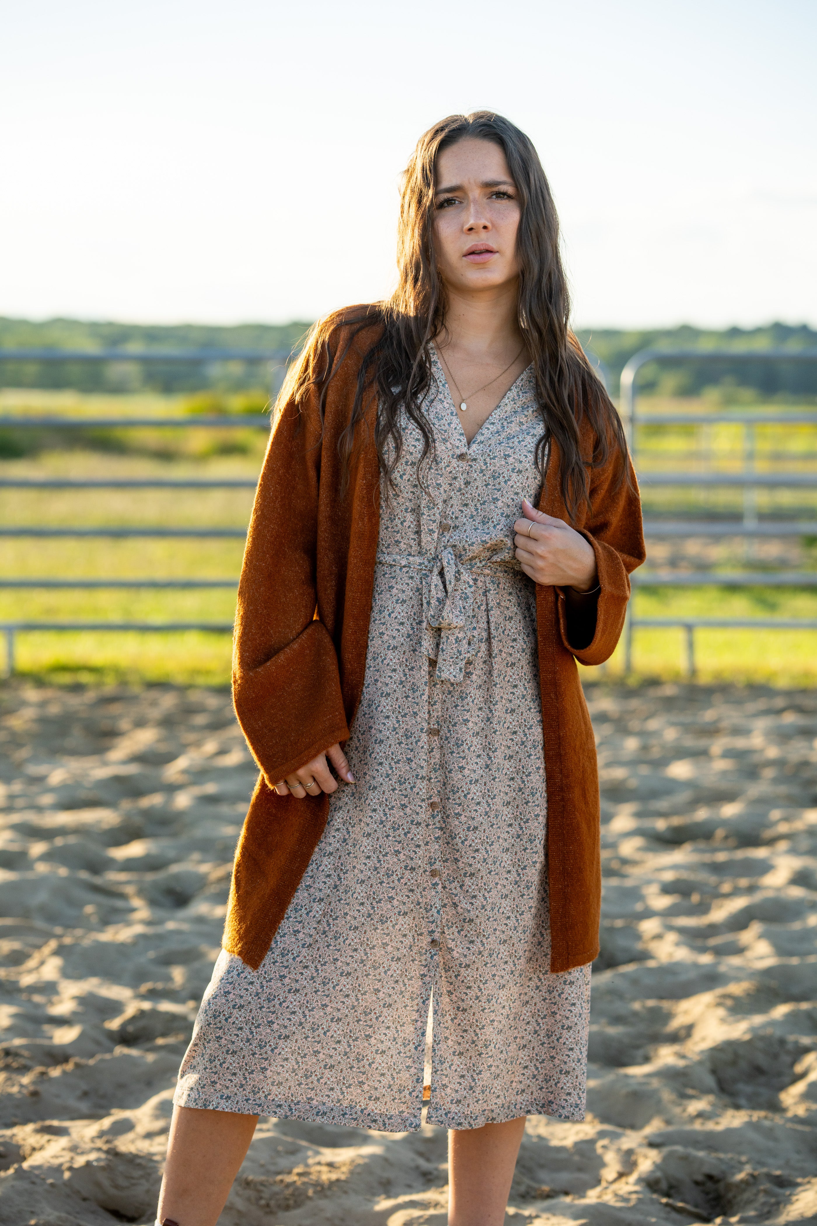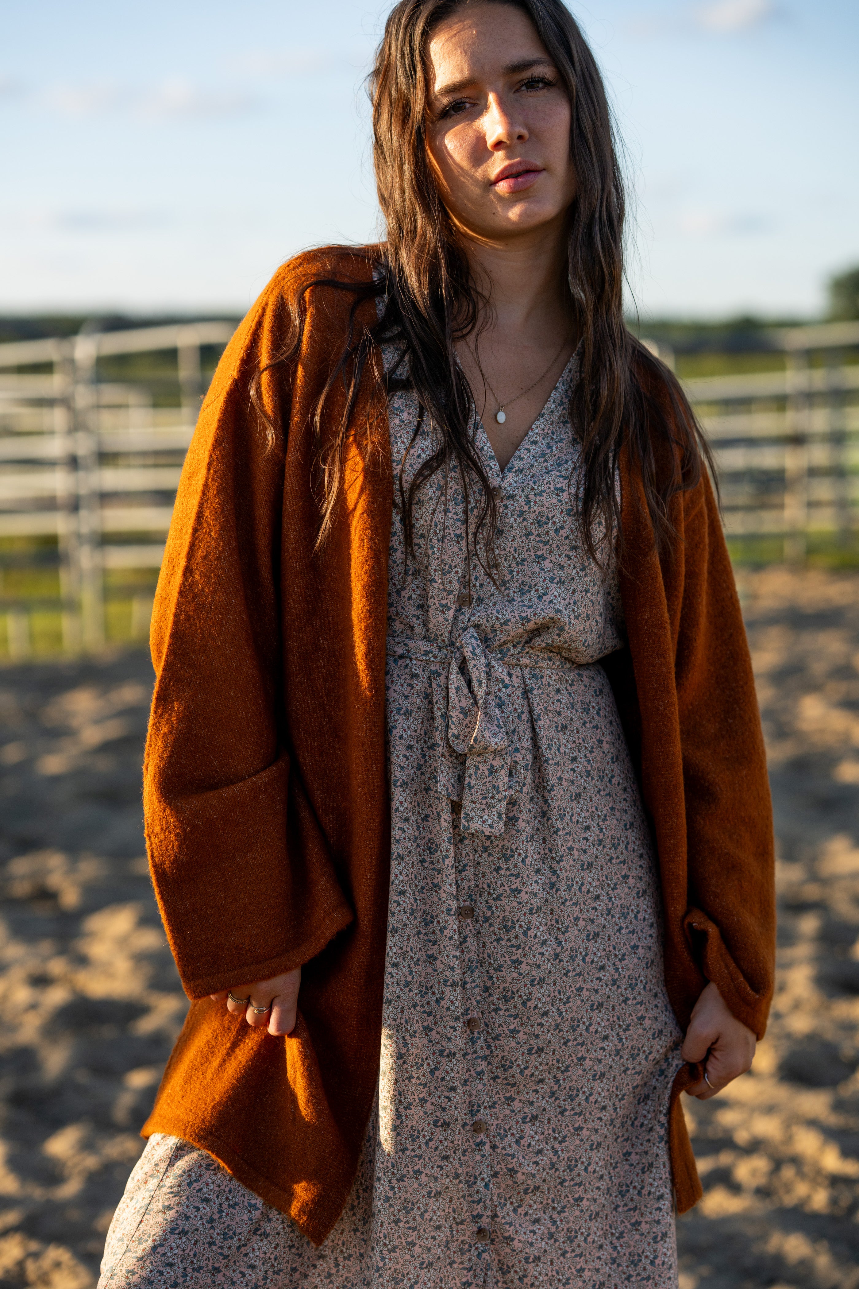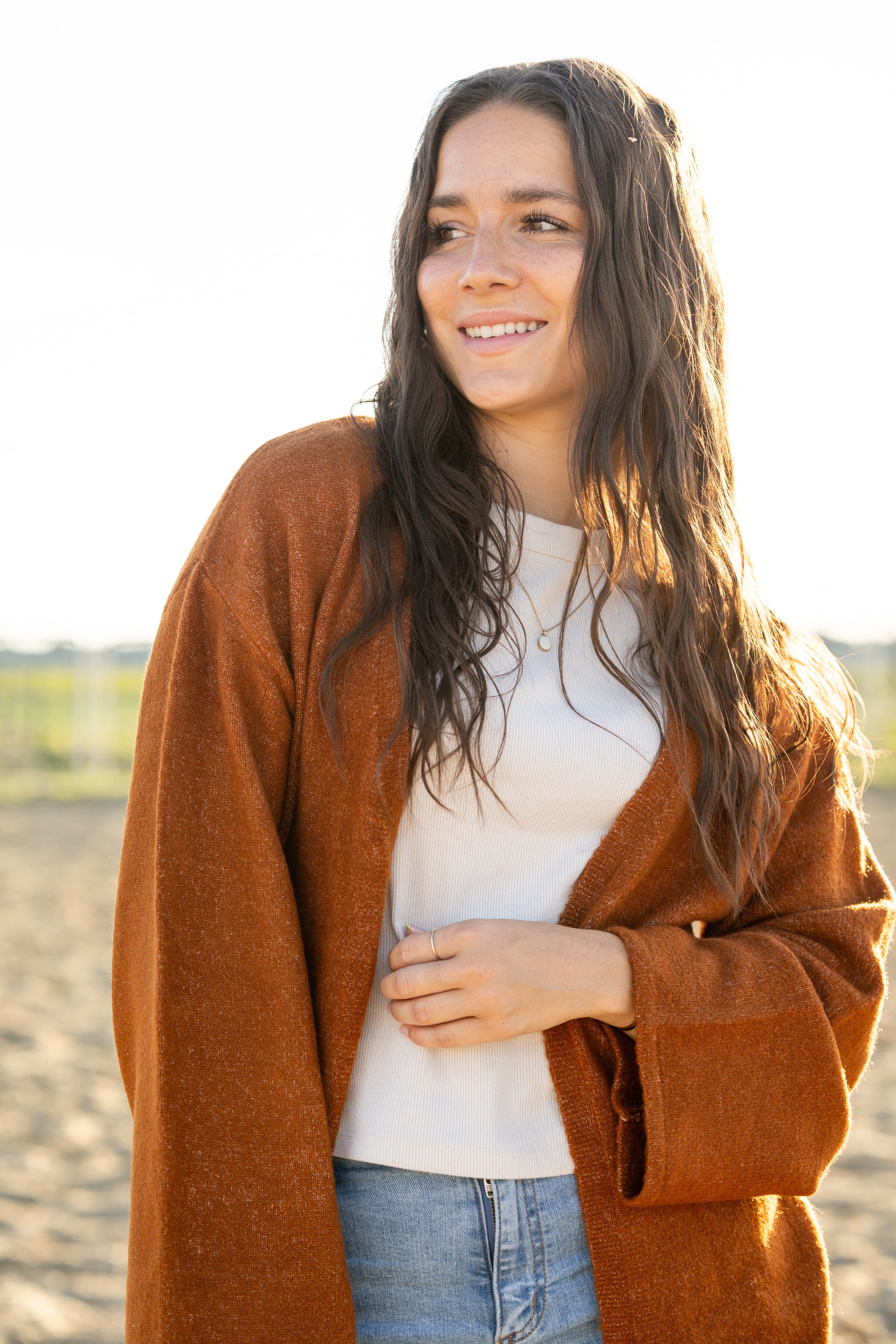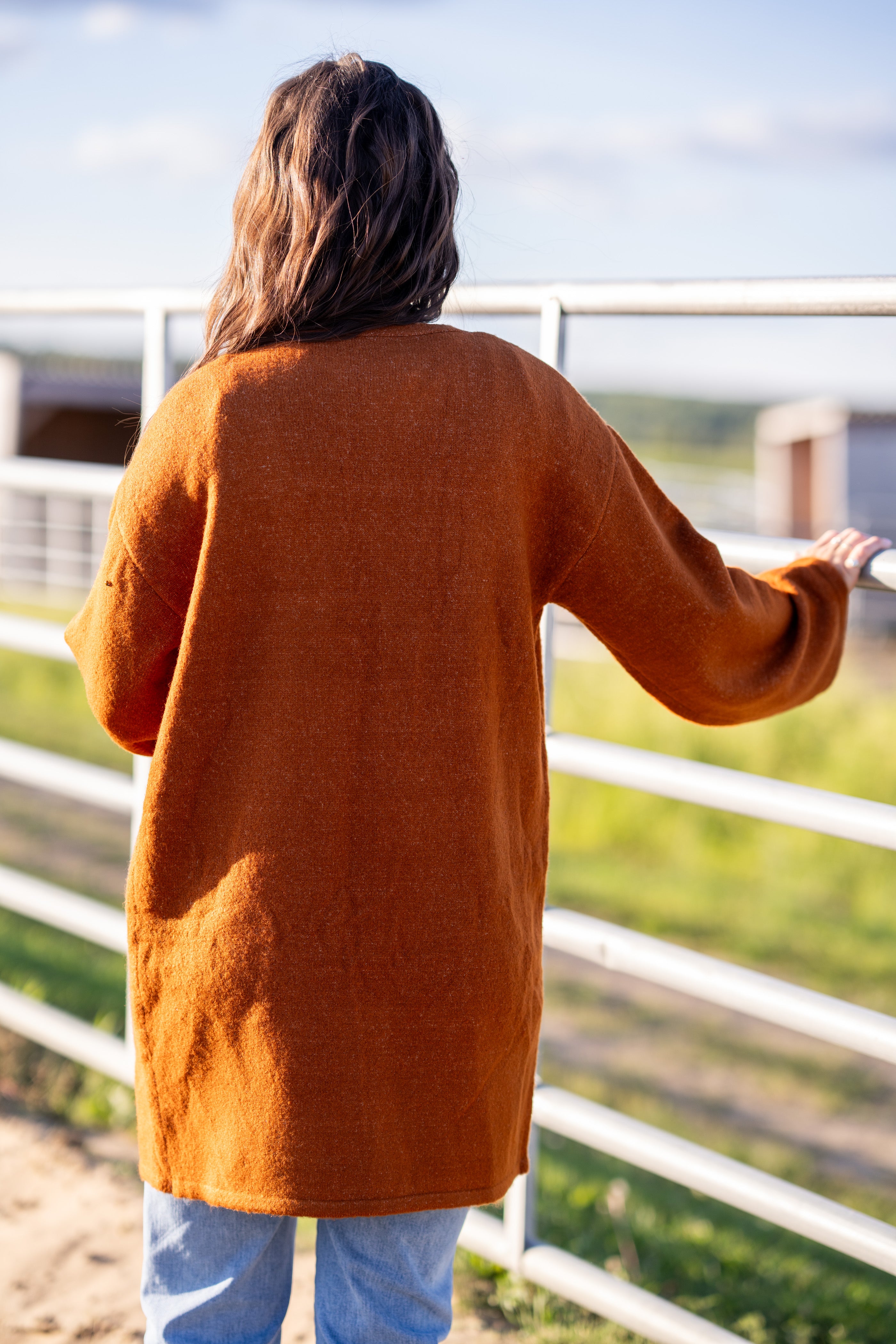 This knitted cardigan stands out with its relaxed fit and wider sleeves, creating an effortlessly modern, laid-back silhouette. Its mid-thigh length makes it a versatile layering piece, perfect for elevating everyday outfits.