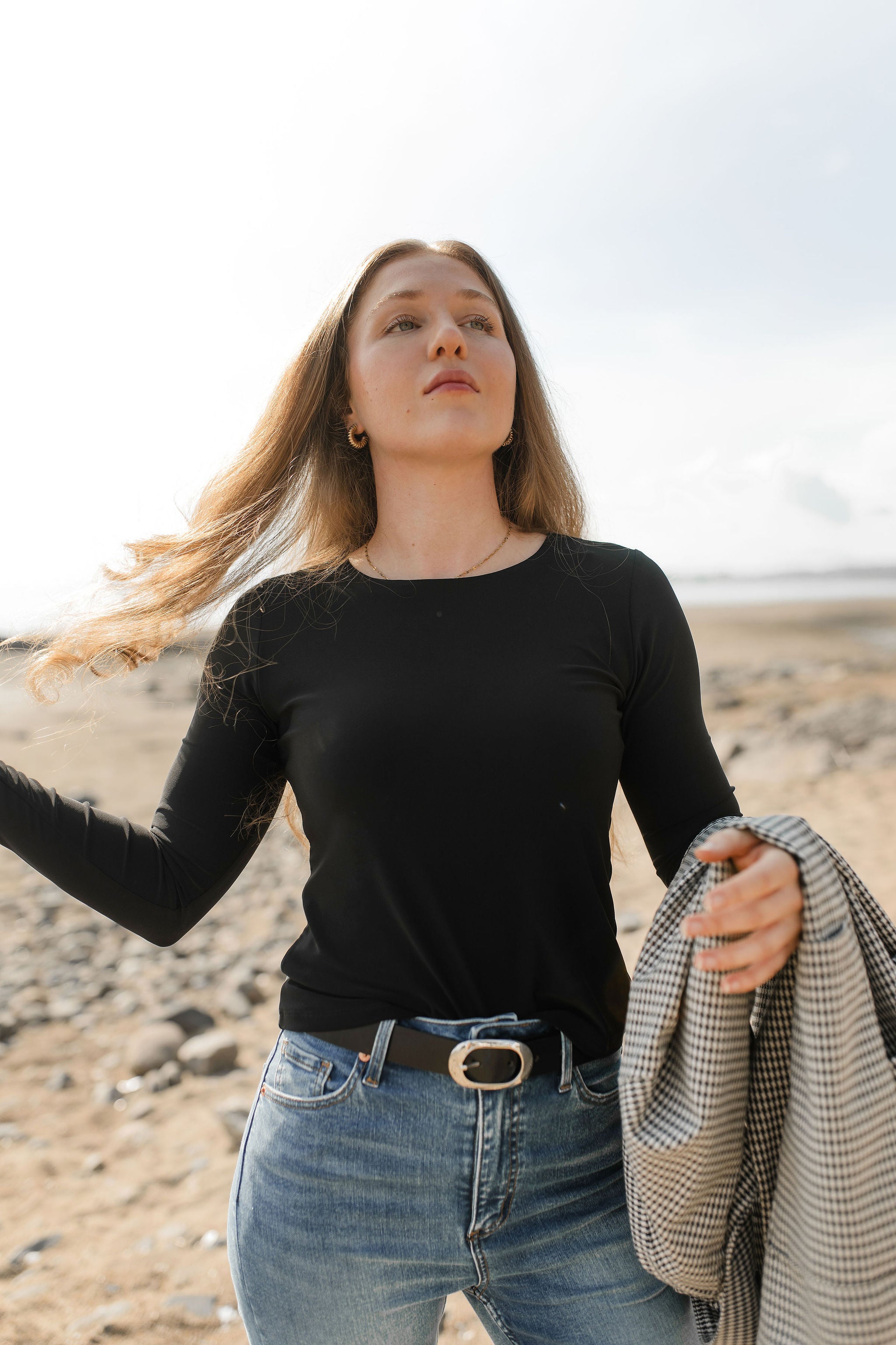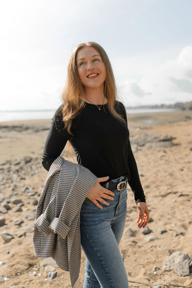 Featuring long sleeves, a round neckline, and a high collar, this simple and classic piece easily transitions from casual to chic. An essential you’ll reach for again and again.