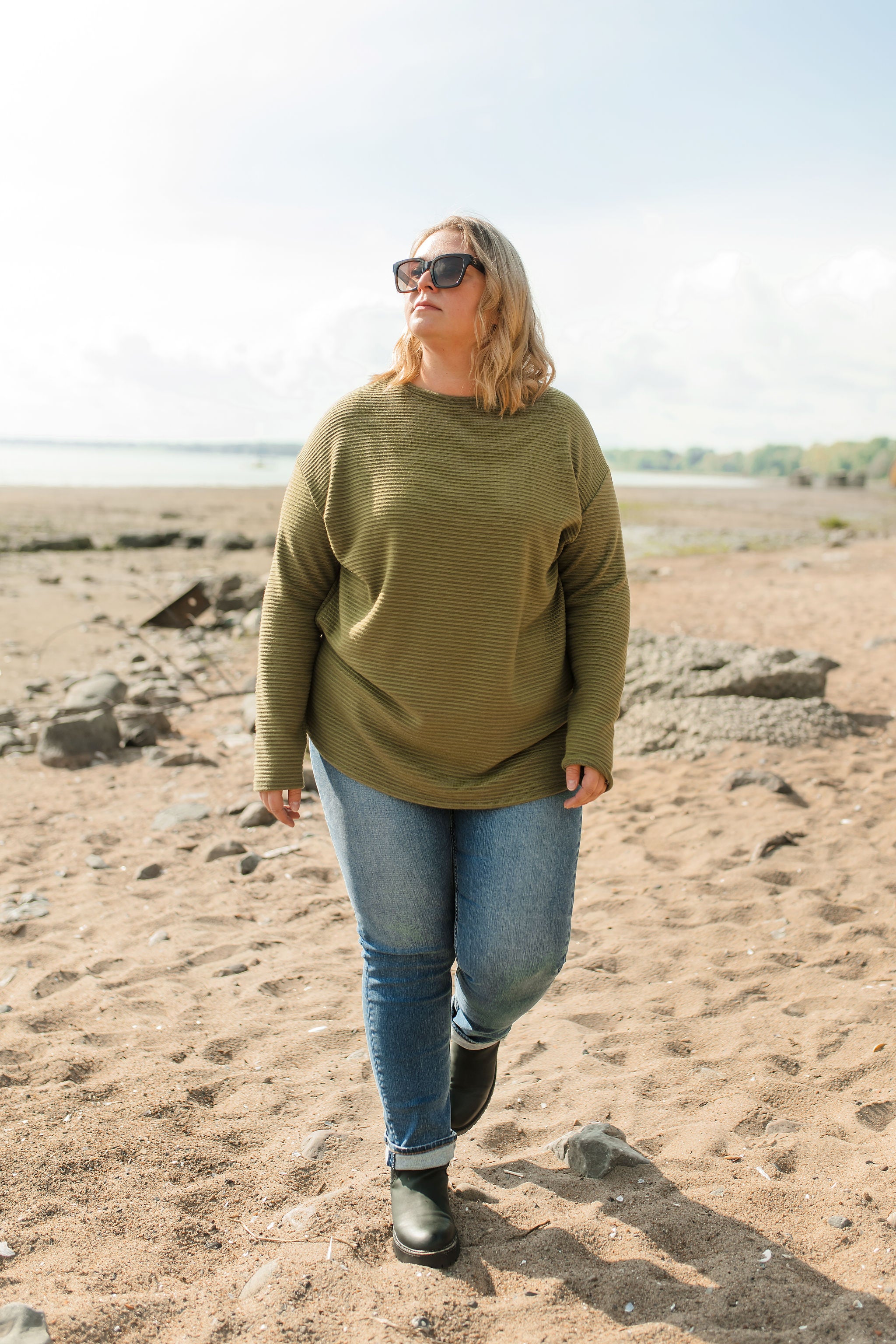 Chandail à col rond ample en tricot côtelé (49 % rayonne, 27 % nylon, 21 % polyester, 3 % spandex).