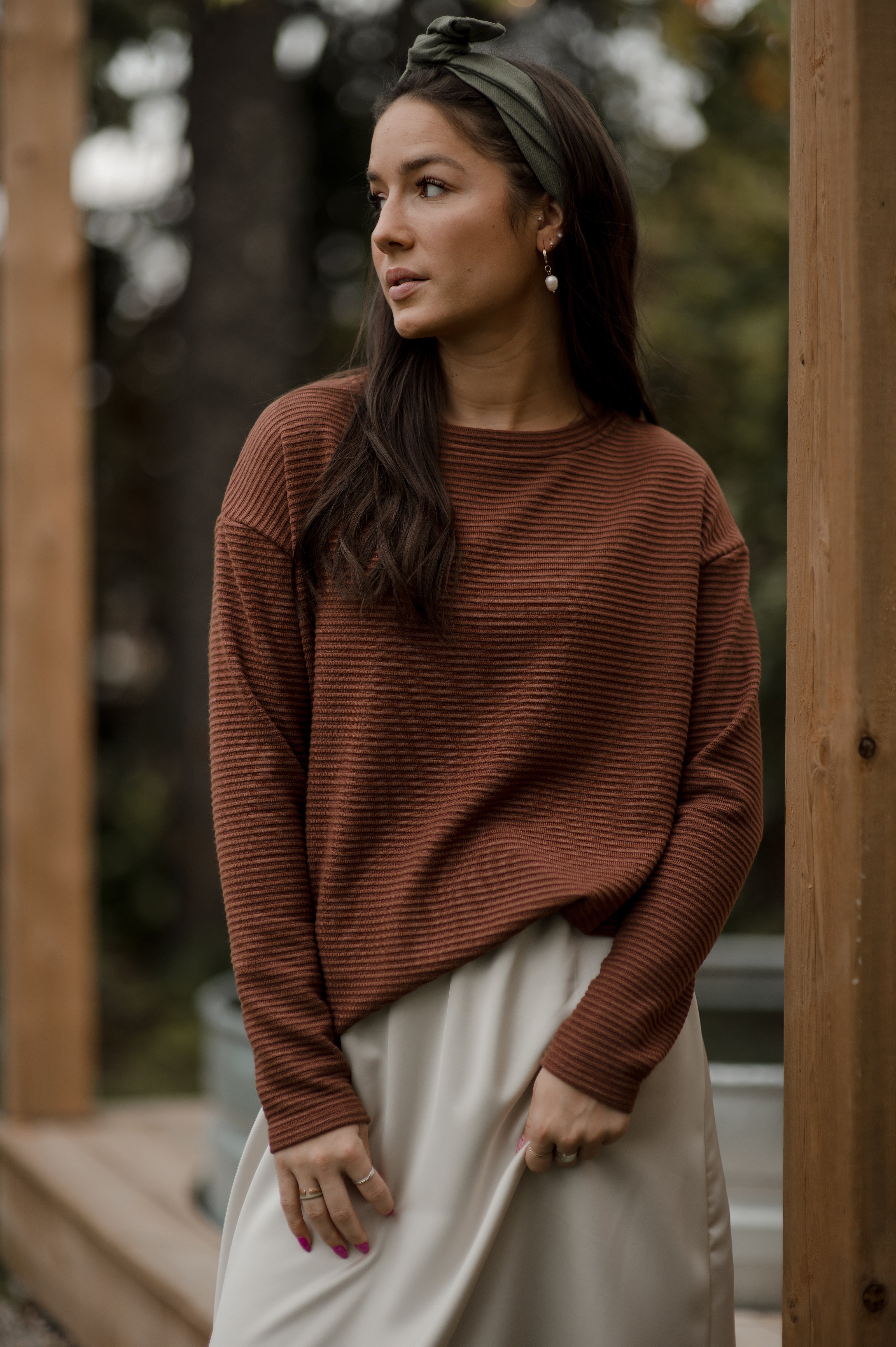 Chandail à col rond ample en tricot côtelé (49 % rayonne, 27 % nylon, 21 % polyester, 3 % spandex).